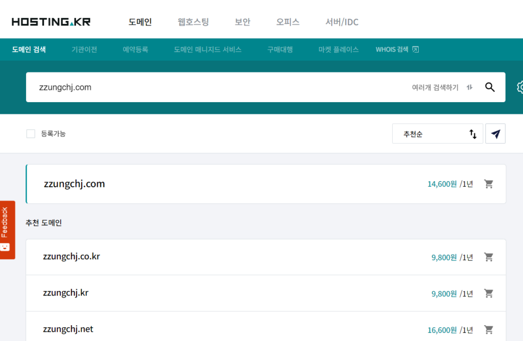 예를 들어 www.zzungchj.com 이라는 도메인을 결정했다면 위에서 언급한 도메인 서비스 업체에서 검색해 볼 수 있는데요.
