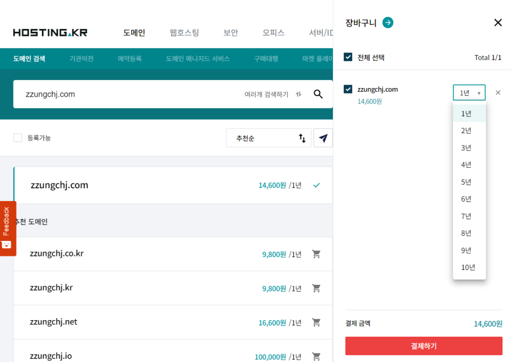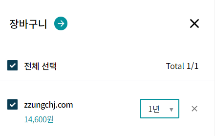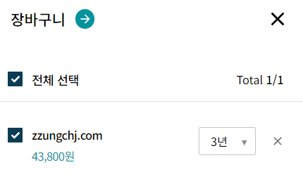 구매하고자 하는 도메인을 장바구니 아이콘을 클릭하면 가입년수를 선택하고 결제하기 화면이 나옵니다.