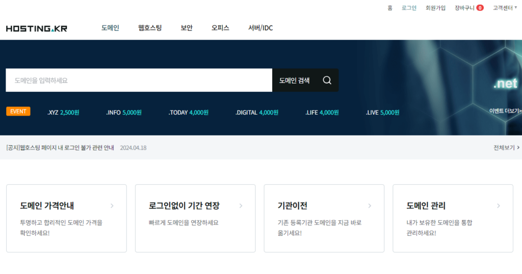 호스팅KR을 기준으로 도메인 검색하고 신청하는 방법을 아래에서 설명드릴게요.