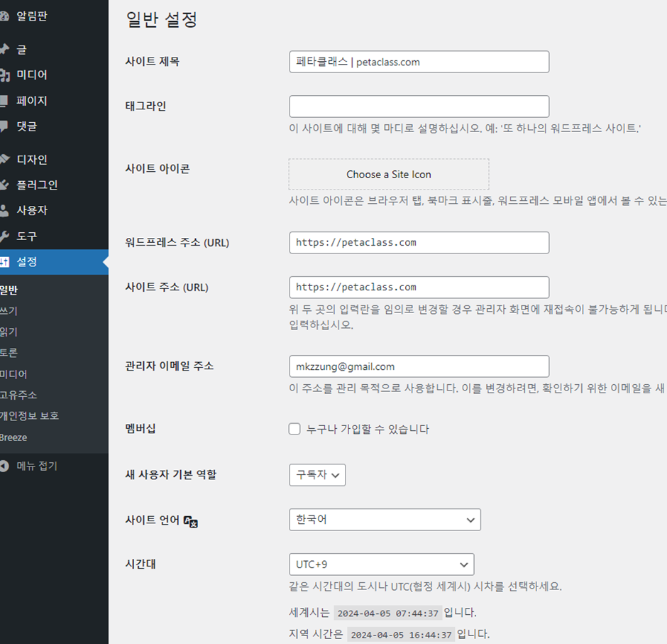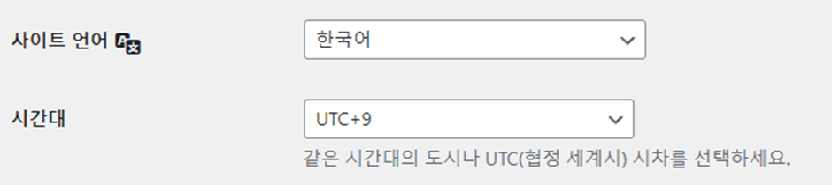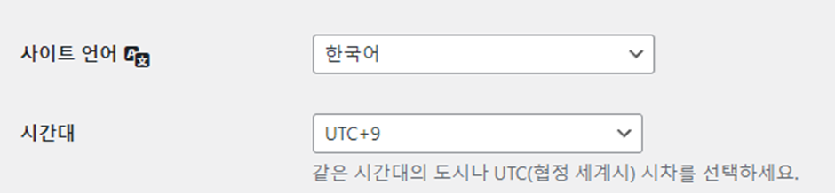 설정 > 일반 클릭 > 사이트 언어를 한국어, 시간대를 UTC + 9 (서울)을 선택하한 후 저장 버튼 클릭
