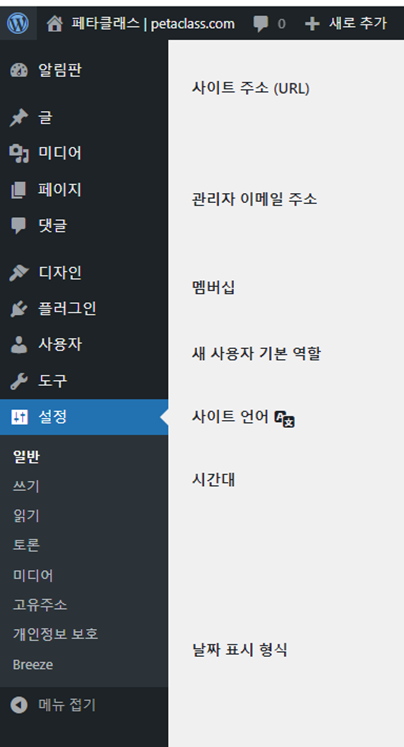 petaclass.com/wp-admin/ 이것으로 워드프레스 관리자 화면 주소입니다.