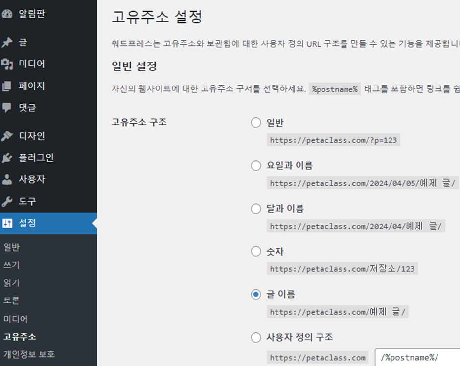 설정 > 고유주소 è 글 이름 선택