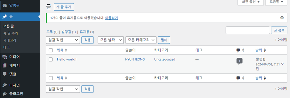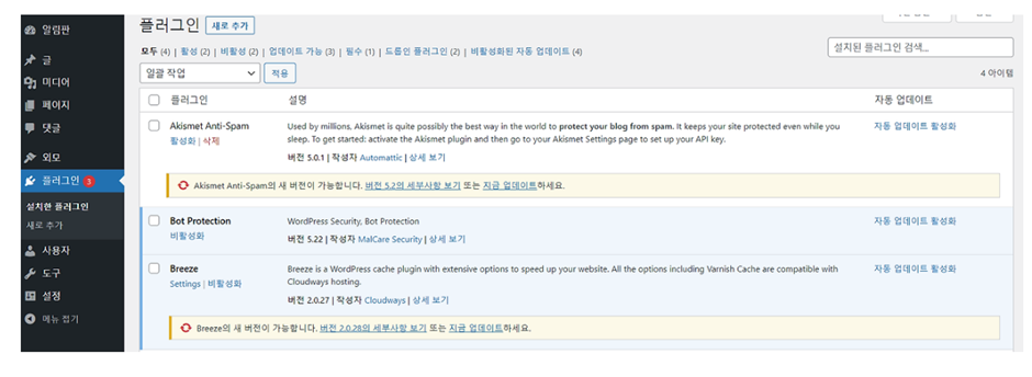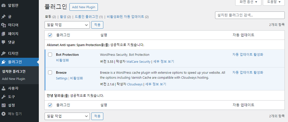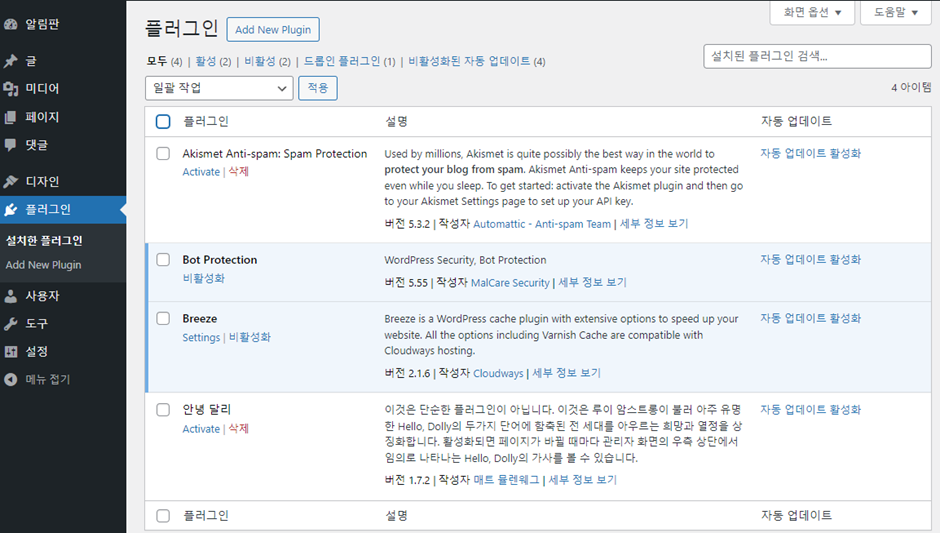 이미 설치된 플러그인 중 Akismet Anti-Spam,안녕 달리 등은 삭제하도록 합니다.