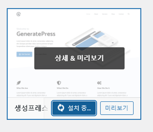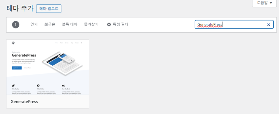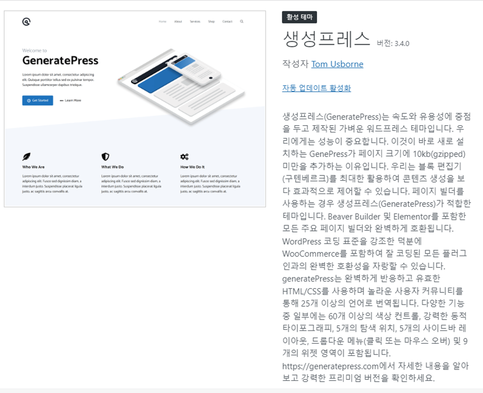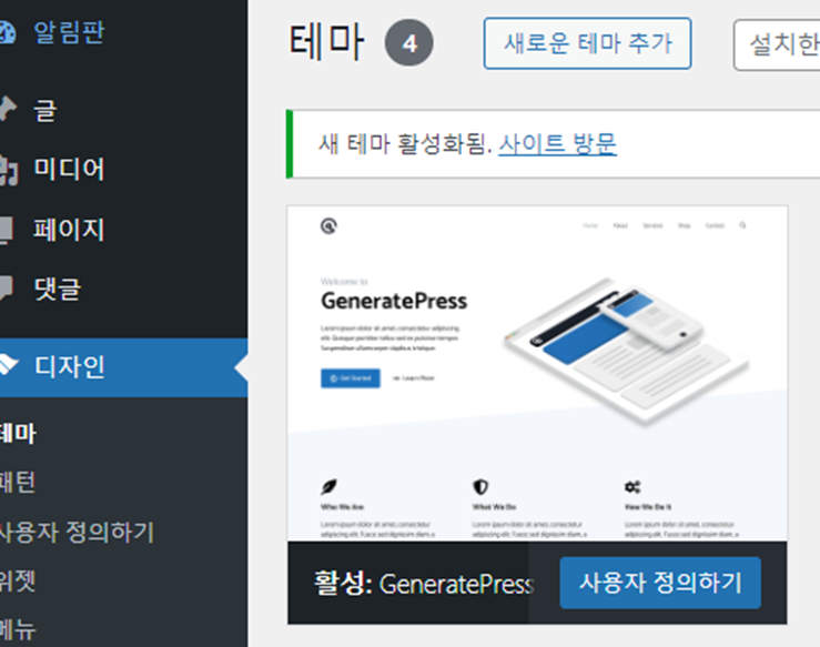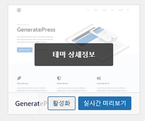 ‘GeneratePress’ 라는 테마를 설치한 후 활성화합니다.