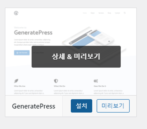 이미지에 마우스 오버하면 설치 상세&미리보기, 설치, 미리보기 버튼이 생성됩니다.