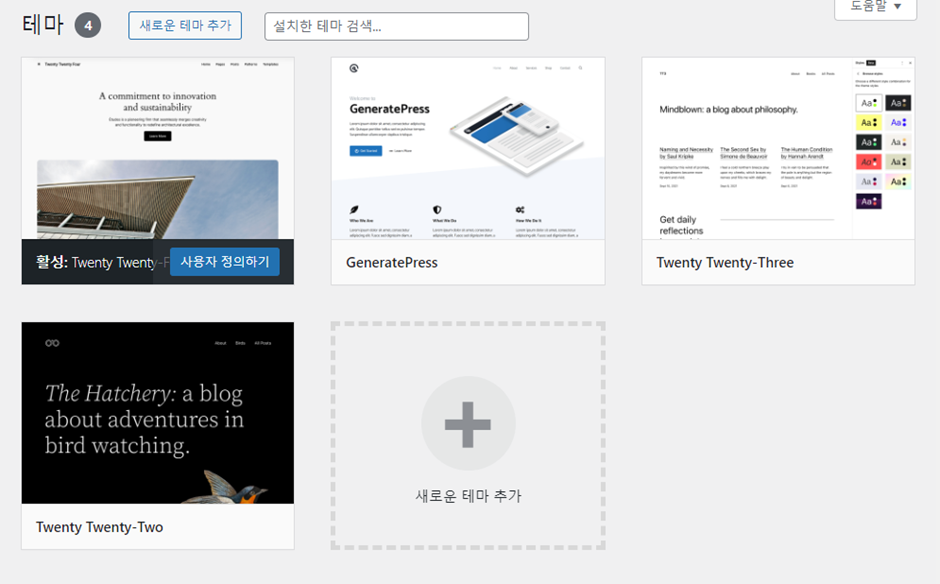 테마 탭에 들어가보면 다음과 같은 기존 테마들이 설치되어 있는데요.