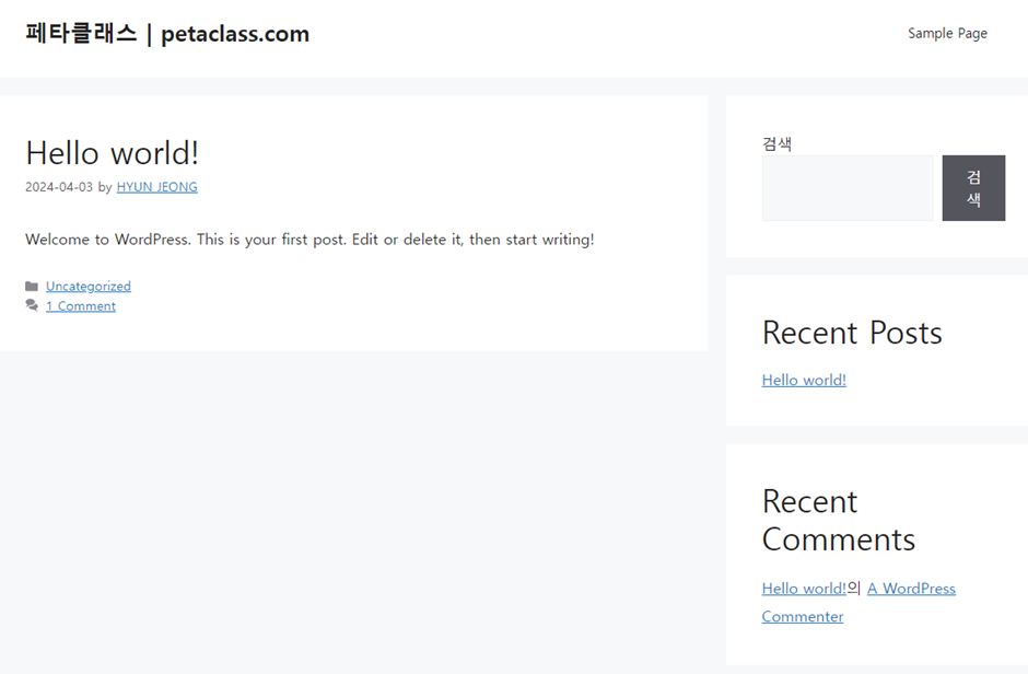 방금 설치한 테마를 적용 (활화 버튼 클릭)해 보면 내 홈페이지가 아래와 같이 변경됩니다.