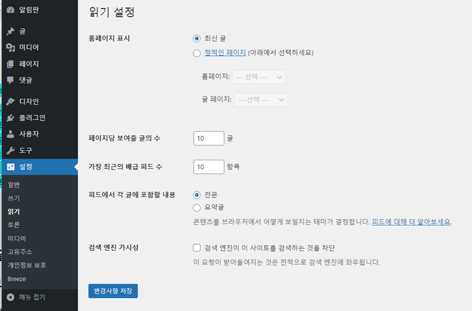 추가로, 설정 > 읽기 탭에서 ‘검색 엔진 가시성’ 부분에서 ‘검색 엔진이 이 사이트를 검색하는 것을 차단’하는 내용의 박스가 체크되어있지 않아야 합니다.
